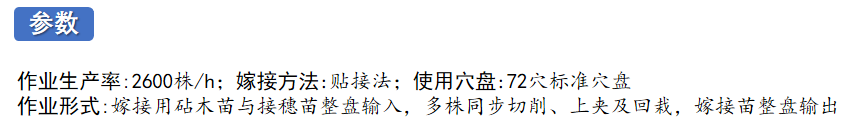 茄果类全自动嫁接机以番茄、茄子及辣椒种苗为作业对象,自动整盘上砧木苗与接穗苗,可实现接穗苗与砧木苗上苗、多株同步切削、对位、上夹、穴盘回栽及穴盘嫁接苗输出高效全程自动作业。与人工移植作业相比,穴盘苗移植作业效率可提高6倍以上。