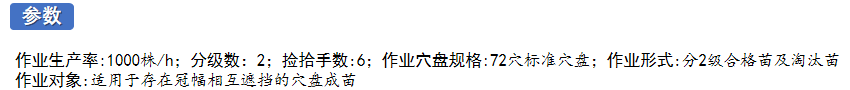 控制穴盘苗长势及形态差异是确保穴盘苗售价和嫁接、移植等机械作业质量的重要技术手段,这个作业环节一直以来都是靠人工完成,作业效率和作业质量不稳定。穴盘苗自动分级是针对所有穴盘苗,依据栽培要求,基于机器视觉技术,将合格苗分成多个等级输出,不合格苗弃除。作业过程自动完成由穴盘苗取出穴盘苗、视觉评价、分级输送、分级回栽及分级整盘输出自动作业。该设备可根据长势与形态等因素设定分级要求,实现目标管理分级,其优势是可针对冠幅相互遮挡的穴盘苗进行分级作业。与人工分级作业相比,穴盘苗分级机作业效率可提高倍5以上。